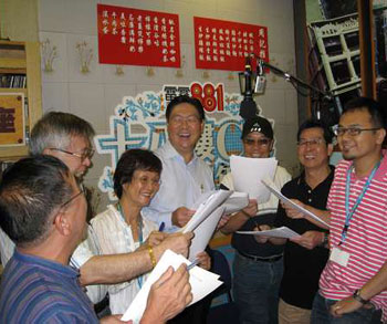 圖:馬時(shí)亨(中)客串電臺(tái)節(jié)目。(圖片來源:大公報(bào))