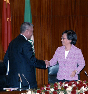 答問(wèn)會(huì)結(jié)束,何厚鏵與曹主席握手。(圖片來(lái)源:澳門日?qǐng)?bào))