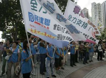 資料圖:九月香港立法會選舉七月十九日開始接受提名,選舉事務處總共接獲三十八份提名表格。圖為民建聯(lián)在長沙灣區(qū)舉行宣傳儀式,民建聯(lián)全部二十九位參選人聯(lián)同二百人助選團出席報名儀式,為大家打氣加油。 中新社發(fā) 張勤 攝