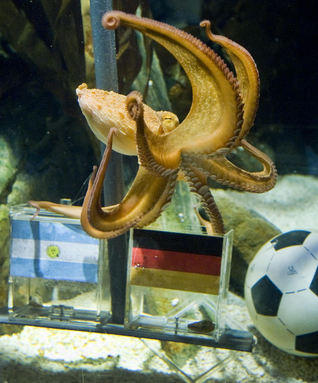 中新網(wǎng)7月2日電 據(jù)外媒7月1日報道,德國有只名為保羅的章魚最近很紅,因為它已準確預(yù)測了四場比賽結(jié)果。在即將到來的德阿之戰(zhàn)中,保羅又看好德國,這令德國球迷興奮,阿根廷球迷心堵。但近日,一只來自阿根廷的海豚向保羅發(fā)起挑戰(zhàn),海豚似乎更青睞于阿根廷。