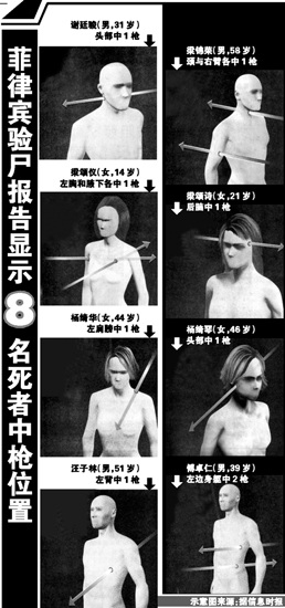 據(jù)報道,29日,菲律賓國家警察(PNP)發(fā)言人克魯茲(Agrimero Cruz)表示,經(jīng)子彈彈道測試,這8名遇難港人的傷口均是遭劫持巴士內(nèi)一把大口徑武器造成的。