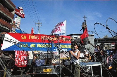 28日,遭強(qiáng)制拆遷的菲律賓民眾在菲總統(tǒng)府外倒掛國(guó)旗,集會(huì)抗議政府強(qiáng)制拆遷首都馬尼拉的貧民窟。