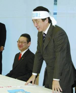 在和長(zhǎng)谷川市長(zhǎng)交談前,菅直人頭上系了一條寫(xiě)有“歸還北方四島”的頭巾,表達(dá)對(duì)此事的強(qiáng)硬態(tài)度。