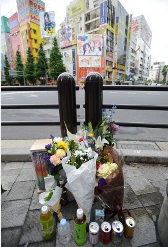 據(jù)日本《每日新聞》6月8日?qǐng)?bào)道,2008年,東京秋葉原步行街發(fā)生一起當(dāng)街砍人事件,共造成7人死亡,10人重傷。8日,事件迎來了發(fā)生五周年紀(jì)念日。曾是派遣公司職員的犯罪嫌疑人加藤智大以殺人罪被起訴,一審判決和二審判決均為死刑。在事件現(xiàn)場(chǎng)的十字路口的一個(gè)角落,從8日一早就開始有人供奉鮮花,并雙手合十祈禱。