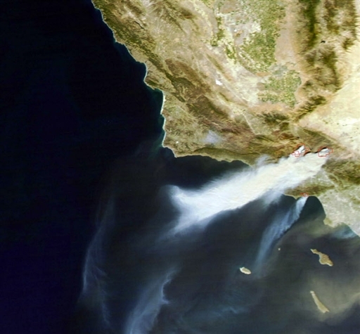 中新網(wǎng)10月23日電 美國加州近日多處發(fā)生山火,最少有9個(gè)火頭,圣迭戈縣有兩個(gè),以北的海邊豪宅小鎮(zhèn)馬利布則有7個(gè),加州州長施瓦辛格宣布7個(gè)縣進(jìn)入緊急狀態(tài);痤^逼近民居和一所大學(xué),最少3.6萬人須疏散,其中不乏好萊塢明星。山火共計(jì)燒毀了最少3萬英畝的土地和39幢房子,1500名消防員參與撲救工作。圣迭戈的火警造成1死,最少17人傷,包括4名消防員。衛(wèi)星拍攝到美國加州山火十分嚴(yán)重(見圖)。