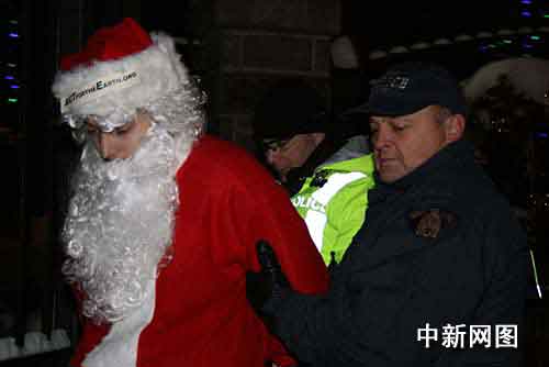 抗議行動中,警察一共抓了7名環(huán)保人士,雖有肢體接觸但沒有任何人受傷。一排著紅衣服的“圣誕老人”把囚車塞得滿滿的,剩下一些舉著標(biāo)語牌的老弱婦孺在原地繼續(xù)游行。