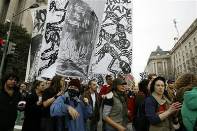 華盛頓的示威者打算“封鎖”國家稅務局,另一些示威者則會設法阻止K街的“發(fā)戰(zhàn)爭財者”。K街是華盛頓公司游說者的大本營。