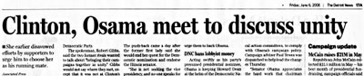 中新網(wǎng)6月8日電 美國前日出版的報(bào)章《底特律新聞》,約4.5萬份報(bào)紙的17A頁上,標(biāo)題寫錯(cuò)成《希拉里、奧薩瑪會面商團(tuán)結(jié)》(見圖),把民主黨總統(tǒng)選舉準(zhǔn)候選人奧巴馬(Obama)的名字,錯(cuò)拼做“基地”恐怖組織領(lǐng)袖奧薩瑪(Osama)•本•拉登。