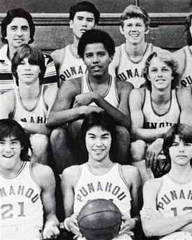 奧巴馬(第二排中間)在1977年高中時的照片。奧巴馬熱愛籃球,曾是學(xué);@球隊成員,大四時還隨隊獲州聯(lián)賽冠軍,作為一名前鋒擅長左手投籃?赡芤蛎諳bama發(fā)音的緣故,被隊友戲稱為轟炸機(jī)(O'Bomber)。