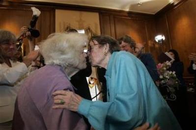 據(jù)美國《明報》報道,66歲的泰勒跟54歲同志情人奧爾森,多年來一直爭取同性婚姻權利,正是他們的上訴,最終促成加州最高法院推翻州政府的同性婚姻禁令。兩人已準備在16日下午5點01分結婚,成為洛杉磯縣區(qū)首對正式同志“夫妻”。泰勒說﹕“我們準備在法院外結婚,因為這是我們多年來斗爭的地方,在這兒結婚宣布‘我們勝利’,無疑是美妙的事!痹诩又萃緞俚匚骱萌R塢,有酒店表示,在最高法院上月裁定同性婚姻合法后,入住率不斷攀升,“我們17日的房間差不多已經(jīng)訂滿,未來一周也差不多。以往我們的入住率不會這樣高!