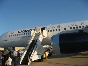 奧巴馬的競選專機是由一架波音757客機改裝而成的,整個機艙共分為三個部分,其中機頭部分是奧巴馬、他的家人以及高級助手們專用的豪華客艙,其后是專機機組人員專用休息艙,再后面則是商務客艙,接近機尾部分是專門為隨機采訪的媒體人士而設的經(jīng)濟客艙。奧巴馬選擇這架波音757客機作為專機后,對它進行了較大幅度的改裝,他們將專機涂上了藍白色相間的顏色,機身兩邊寫著奧巴馬的其競選口號--“我們可以相信的改變”。其中引起強烈爭議的部分,則是奧巴馬將客機尾翼上的美國星條旗抹除掉,而噴上帶有太陽初升的奧巴馬獨特標志。這架專機改裝完成后,立即載著奧巴馬競選陣營的工作人員和媒體人士飛行中東,奧巴馬21日更是乘坐這架競選專機飛抵伊拉克,并與伊拉克官員以及駐伊美軍高級將領會面。
