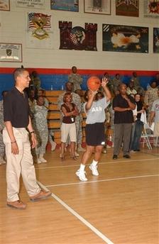 奧巴馬很喜歡打籃球,競(jìng)選活動(dòng)再忙,每隔一段時(shí)間,他還是會(huì)抽空打場(chǎng)籃球賽,這次海外訪問,他也在阿富汗的美軍基地痛快了一場(chǎng)。
