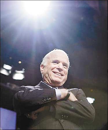 在外交和軍事政策領(lǐng)域的比拼中,古稀之年的麥凱恩顯然要比少年得志的奧巴馬老練得多。出身將門的麥凱恩可謂身經(jīng)百戰(zhàn),其作為戰(zhàn)俘在越南監(jiān)獄中度過5個(gè)春秋的傳奇經(jīng)歷更使其愛國精神無人能敵。麥凱恩一方面充分利用這些有利條件把自己塑造成美國民眾足可信賴的政治家和總司令,另一方面持續(xù)攻擊奧巴馬缺乏外交和軍事經(jīng)驗(yàn)的弱點(diǎn)。