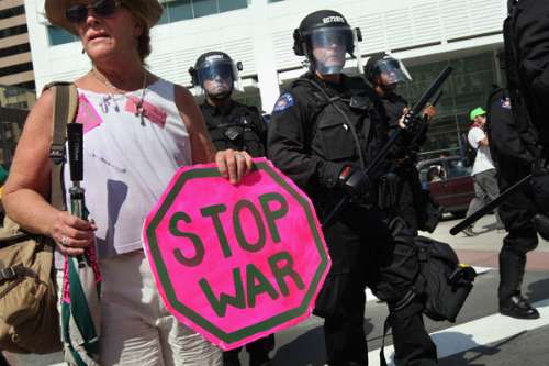 數(shù)百名反戰(zhàn)示威者二十四日在丹佛市集會(huì)