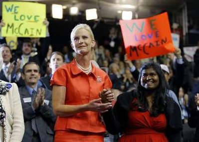 麥凱恩妻子辛迪與孟加拉裔養(yǎng)女在共和黨代表大會上。