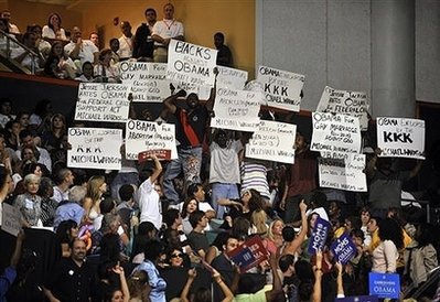 據(jù)“中央社”報道,希望成為史上首位非裔美國總統(tǒng)的奧巴馬19日在邁阿密大學(xué)的籃球館舉行造勢集會,正當(dāng)他在臺上發(fā)言時,觀眾席看臺角落出現(xiàn)抗議群眾,他們手持標(biāo)語,上頭寫道:“三K黨支持奧巴馬!