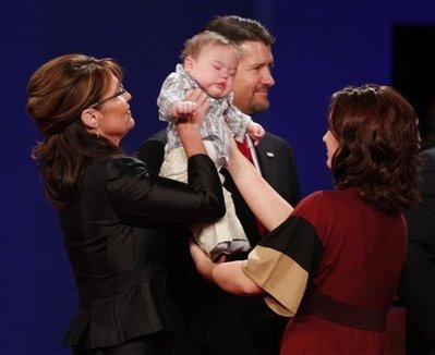 佩林抱兒子亮相副總統(tǒng)候選人辯論。
