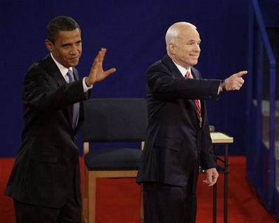 據(jù)美聯(lián)社報道,美國當(dāng)?shù)貢r間10月7日晚上21點左右(北京時間10月8日早上9點左右),美國共和黨總統(tǒng)候選人麥凱恩和民主黨總統(tǒng)候選人奧巴馬在田納西州的貝爾蒙特大學(xué)開始辯論,這是兩人選舉議程的三場辯論中的第二場辯論。