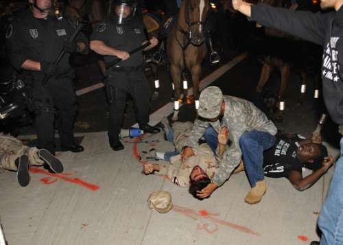 15日辯論會(huì)場(chǎng)外,警員與反戰(zhàn)示威者發(fā)生沖突。