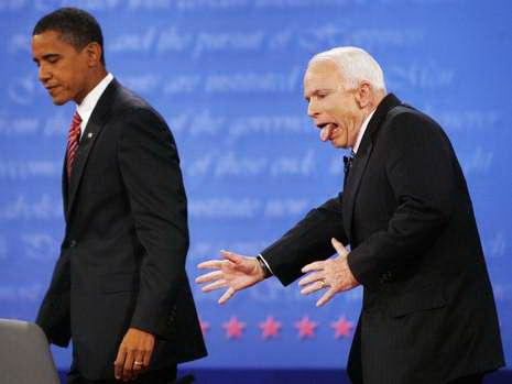 資料圖:麥凱恩在電視辯論時(shí)吐舌頭作鬼臉,數(shù)百萬(wàn)電視觀眾看到了他搞笑的一幕。