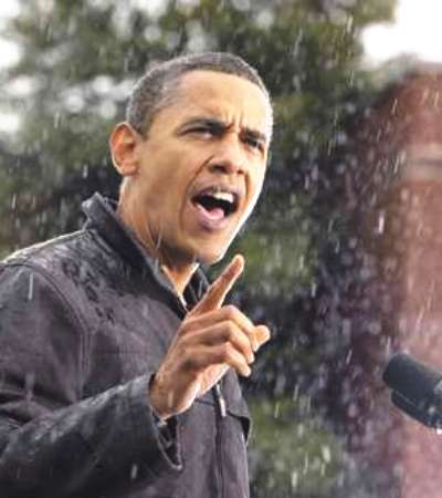 奧巴馬前日一身休閑裝,冒雨拉票。