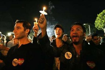 憤怒的人群擁堵在洛杉磯西好萊塢的同性戀聚集區(qū),揮舞標(biāo)語(yǔ)高喊口號(hào),表達(dá)不滿。一位抗議者裸露的胸前寫著:我是八號(hào)提案的受害者!