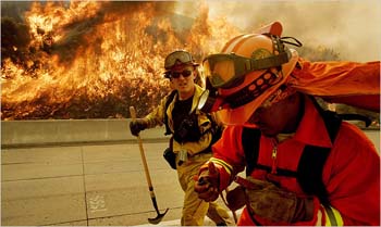 加州南海岸空氣質(zhì)量管理委員會警告,山林大火所造成的空氣污染,對南加州居民的健康有相當(dāng)?shù)奈:,建議減少外出、緊閉門窗,避免呼吸道出現(xiàn)不適的征狀,甚至引發(fā)老年人心臟等方面的疾病。山火于十三日傍晚六時燃起,當(dāng)局派出一千二百名消防員及多架直升機撲救,但由于當(dāng)?shù)亟諝鉁財z氏三十度,加上刮起時速一百一十五公里強風(fēng),火乘風(fēng)勢蔓延得很快,一夜間焚毀了最少六百零七公頃林木。