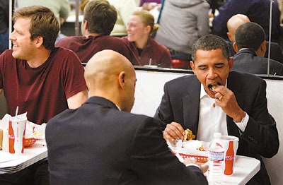 中新網(wǎng)1月12日電 據(jù)香港《文匯報(bào)》報(bào)道,美國(guó)候任總統(tǒng)奧巴馬月初由老家芝加哥搬到華盛頓準(zhǔn)備就職,10日中午突然現(xiàn)身華盛頓鬧市,到當(dāng)?shù)刂麩峁房觳偷赀M(jìn)餐,又與圍觀者拍照,大打“親民牌”,引起全場(chǎng)哄動(dòng)。奧巴馬其后到前總統(tǒng)林肯紀(jì)念館,在就職前向這位他心目中的英雄致敬。