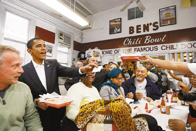 前天奧巴馬與華盛頓市長(zhǎng)芬蒂,到當(dāng)?shù)厥兄行囊婚g著名的熱狗快餐店進(jìn)餐。由于正值午餐時(shí)間,店內(nèi)大批顧客見(jiàn)到奧巴馬大駕光臨,無(wú)不歡喜尖叫。奧巴馬向顧客打招呼并拍照留念,又抱起一名嬰兒,盡顯親民一面。