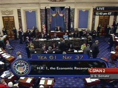 據(jù)悉,美參議院以61票對37票的投票結(jié)果批準(zhǔn)了該經(jīng)濟(jì)刺激計(jì)劃。美國總統(tǒng)奧巴馬則表示,這是個“好消息”。