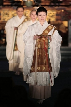據(jù)悉,當天的這場時尚秀以動感hip-pop音樂為背景,約40名和尚和尼姑身著佛教八大流派的各色服裝進行展示。走秀的同時,僧侶們口中高聲誦讀經(jīng)文,還不斷向空中拋灑代表蓮花瓣的五彩紙屑。