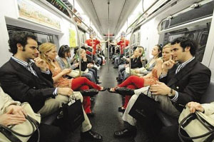 日前,15對(duì)同卵雙胞胎按照亞當(dāng)斯的要求,一起在紐約市布魯克林橋的地鐵站碰頭,15對(duì)同卵雙胞胎走進(jìn)地鐵車廂后,每對(duì)雙胞胎都排著隊(duì)各自坐在了過(guò)道兩側(cè)的座位上,并且每個(gè)雙胞胎要直接面對(duì)著自己的雙胞胎兄弟或姐妹。當(dāng)15對(duì)雙胞胎“各就各位”后,他們接下來(lái)要做的事就是盡可能保持動(dòng)作一致,如果一個(gè)雙胞胎用手撓頭,那么他的同卵雙胞胎也必須用手撓頭;一個(gè)雙胞胎看報(bào)紙,他的同卵雙胞胎也必須低頭看報(bào)紙?傊,他們就好像是對(duì)方的“鏡中影像”一樣。這些同卵雙胞胎還被告知,如果有乘客詢問(wèn)他們到底發(fā)生了什么事,他們要表現(xiàn)得一無(wú)所知,甚至好像壓根沒(méi)看到坐在自己對(duì)面的同卵雙胞胎一樣。