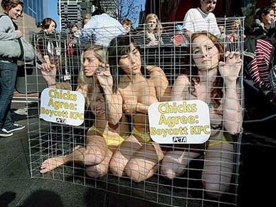 這3名抗議成員只穿著小短褲坐在牢籠里,并掛上“抵制肯德基”的標(biāo)語,抗議肯德基不人道宰殺雞,吸引不少民眾駐足圍觀。