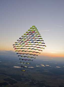 據(jù)報(bào)道,為實(shí)現(xiàn)這一絕技表演,100名跳傘隊(duì)員進(jìn)行了7年的計(jì)劃和訓(xùn)練。他們從5架不同飛行高度的飛機(jī)上跳下,在美國佛羅里達(dá)幾千英尺外的高空上拼成巨大的菱形,表演壯觀驚人,引人注目。