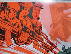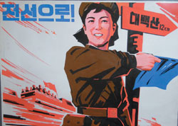 二00七年夏天,朝鮮當(dāng)代畫家作品和國(guó)家畫室制作的宣傳海報(bào)在倫敦La Galleria首展時(shí),現(xiàn)場(chǎng)掛滿了朝鮮紅色的旗幟,英倫天空從來(lái)沒(méi)有那么朝鮮。