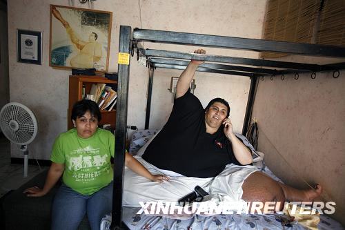 10月2日,在墨北部城市蒙特雷,體形肥胖的曼努埃爾·烏里韋(右)與女友格拉迪亞·索利斯在家中。烏里韋體重曾達到560公斤,被《吉尼斯世界紀錄大全》列為世界最胖之人。經(jīng)過兩年多的減肥治療,他目前體重已降至310公斤左右。烏里韋近日宣布,他將在本月26日迎娶相戀兩年半的女友。新華社/路透