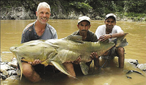 生物學(xué)家威德(左)和兩名當?shù)厝舜揭粭l“食人巨鯰”。