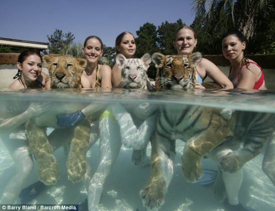 據(jù)英國(guó)《每日郵報(bào)》報(bào)道,在海邊的游泳者要不時(shí)巡視海面以防大鯊魚,不過,對(duì)于美國(guó)南卡羅萊納州一家動(dòng)物園的女訓(xùn)獸師們來說,與小老虎們一起游泳已是她們的例行工作。
