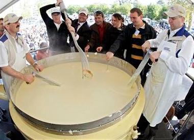 中新網10月27日電 綜合報道,日前在瑞士西部古城莫爾日,眾多志愿者和廚師聚集在一起,試圖制作出世界最大的干酪,創(chuàng)下世界紀錄。