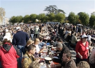 他們把980千克奶酪和420升白酒混合在一起攪拌,然后將成品分成950鍋,分發(fā)給5000名食客。這些觀眾把意大利的經典白面包倒在這融化的奶酪里,津津有味地品嘗,場面極其壯觀。