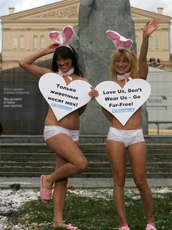 “兔女郎”站在寒冷的莫斯科市區(qū),高舉“愛我們,不要穿皮草”的標(biāo)語(yǔ)。