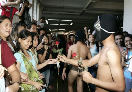 當天,菲律賓大學校園內,由該校兄弟會組織的39名男學生頭戴面具集體裸奔,并向一路驚叫的女生送玫瑰。