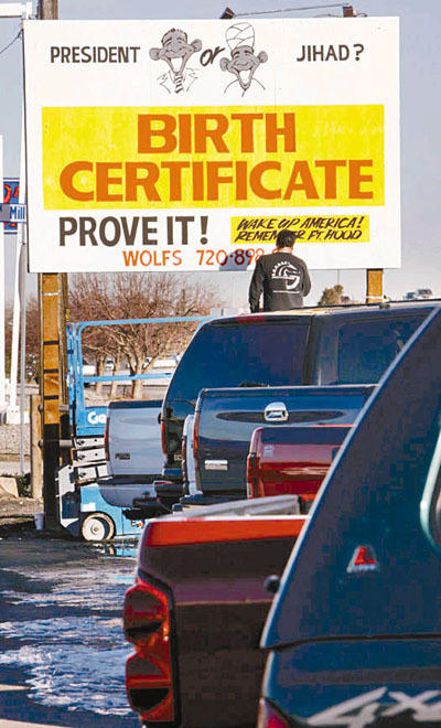 據(jù)香港《文匯報》22日報道,這幅廣告牌豎立于距離丹佛以西11公里的第70號州際公路旁,剛于前日由藝術家里爾完成。奧巴馬卡通肖像下有一個黃色大方格,上書“出生證書,請證明!“顯然在質疑,奧巴馬是否真的在夏威夷出生及擁有美國公民身份。
