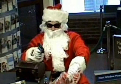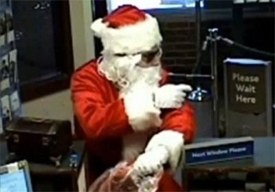 中新網(wǎng)12月24日電 據(jù)英國(guó)媒體報(bào)道,美國(guó)一名男子打扮成慈祥的圣誕老人模樣背著一個(gè)大麻袋走入銀行,正在辦理業(yè)務(wù)的顧客一陣欣喜,以為他要為大家發(fā)禮物,沒(méi)想到這個(gè)“圣誕老人”竟然掏出一把槍?zhuān)蠛耙宦暎簱尳倭耍?table border=0 cellspacing=0 cellpadding=0 align=left>