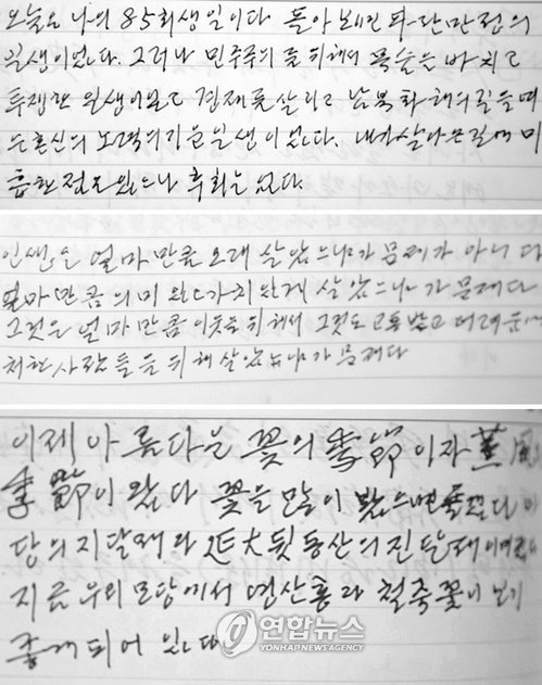 但他還進行自我激勵說:“盡管吃了很多苦,但也取得了與眾不同的成功,年齡也已經(jīng)是85歲,在這世界上還有什么可盼的呢?一定要保持健康,為解決民主主義、國民經(jīng)濟、南北問題等進行必要的諫言和努力!(4月27日)