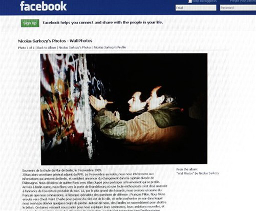 前幾天,薩科齊在社交網(wǎng)站facebook上發(fā)布了一張舊照片,顯示他正在鑿柏林墻,聲稱自己于1989年11月9日用鐵鎬見(jiàn)證了柏林墻的倒塌。