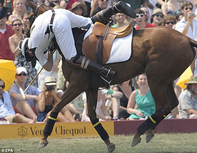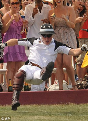 美國當(dāng)?shù)貢r間27日,哈里王子來到紐約總督島參加慈善馬球比賽,為非洲貧困國家的艾滋病孤兒們籌集資金。當(dāng)?shù)鼐用癖鞠胍欢糜踝拥馁愸R英姿卻額外收獲了王子落馬時的窘相。哈里王子跌落后又在地上翻了幾個跟頭,然后迅速起身,看起來身體并無大礙。但他面露羞澀,對這一跤頗感尷尬。