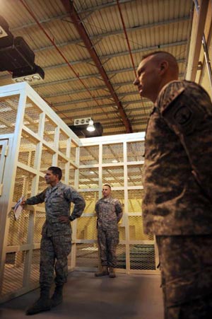 目前,巴格拉姆基地多數(shù)的恐怖疑犯都被囚于一個帳篷拘留所中,但在本月內(nèi)將會有六百四十名囚犯得以遷往環(huán)境較佳的帕爾旺拘留所。掌管這座“新關(guān)塔那摩”的美軍律師馬克.馬丁斯指,關(guān)塔那摩灣監(jiān)獄和伊拉克的阿布格里卜監(jiān)獄都被指違反法律,但帕爾旺拘留所將會被視為一座合理對待囚犯的監(jiān)獄,因為它將會秉持遵守法治和合理程序的兩大原則,并將致力協(xié)助囚犯在出獄后重新融入社會。他說這是美國在對待恐怖疑犯上的“真正進步”,而監(jiān)獄的運作將會具有透明度。
