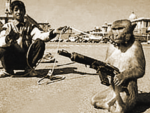 據(jù)英國媒體27日報道,阿富汗的塔利班軍閥們竟想出了一種匪夷所思的方法來對付駐阿盟軍:他們竟將一些愛吃香蕉和花生的猴子訓(xùn)練成了“致命殺手”,教會了這些猴子如何使用卡拉什尼科夫沖鋒槍、布倫式輕機槍甚至迫擊炮,并教它們?nèi)绾螌iT向穿美軍服裝的士兵發(fā)起襲擊。頗具諷刺意味的是,“訓(xùn)練猴子當殺手”的主意最早卻是由美國中情局發(fā)明出來的,美國中情局曾在越戰(zhàn)中發(fā)起“香蕉行動”,專門用花生和香蕉當獎品,訓(xùn)練一些“猴子士兵”在叢林中獵殺越南士兵。