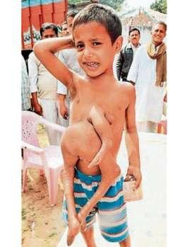據(jù)德國(guó)《圖片報(bào)》2月19日?qǐng)?bào)道,現(xiàn)年8歲的迪帕克·庫(kù)馬爾是一名來自印度比哈爾邦的小男孩。從一出生,他的外貌就把周圍的人驚得目瞪口呆:他長(zhǎng)著4條腿和3支手臂,在他腹中有個(gè)孿生弟弟和他一起來到這個(gè)世界上。